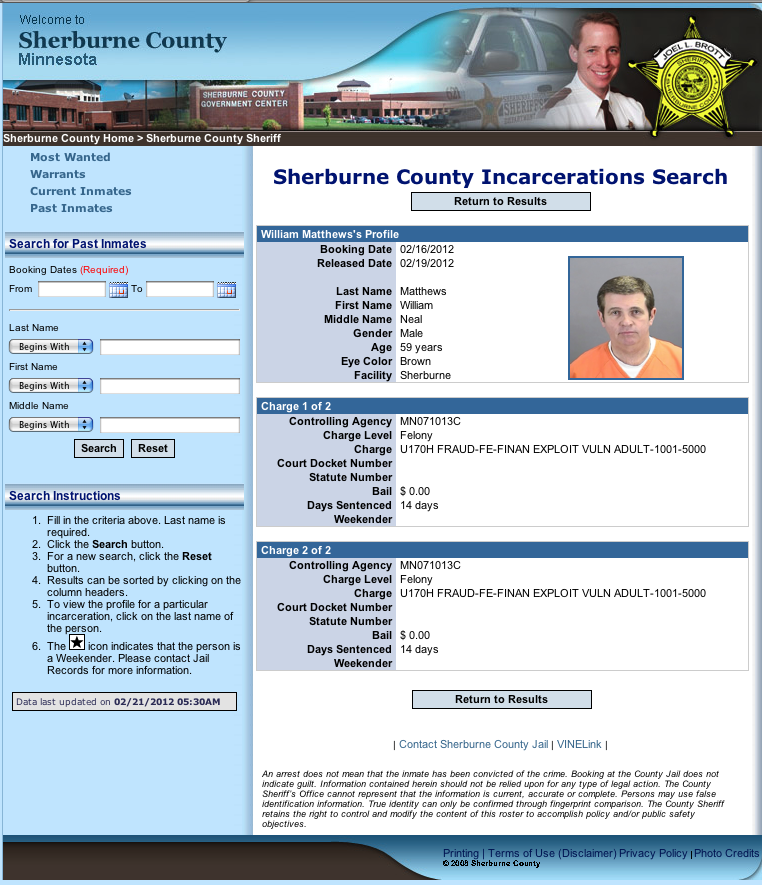 Download Dr. Bill Matthews Felony Case File View Dr. Bill Matthews Jail Mug Shot 02/16/12 Download Dr. Bill Matthews Jail Mug Shot 02/16/12 Download Initial Dr. Bill Matthews Jail Record 02/17/12 Download Final Dr. Bill Matthews Jail Record 02/19/12 View Dr. Bill Matthews Initial Jail Record as of 02/17/12 View Dr. Bill Matthews Final Jail Record as of 02/19/12